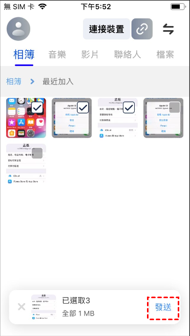 步驟2. 點擊「發送」,之後選中的資料就會轉移到新iPad上。