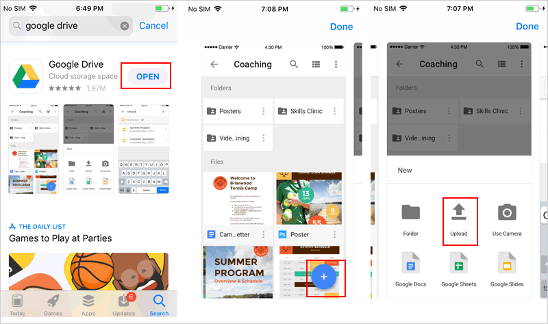 在 iPhone/iPad 上:下載 Google 雲端硬碟 > 開啟應用程式並登入 > 點擊“+”圖示 > 點擊上傳 > 點擊照片和影片 > 選擇要上傳到 Google 雲端硬碟的圖片或影片。
