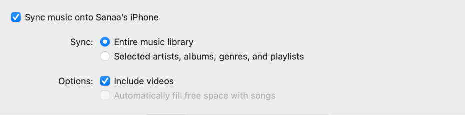 步驟3. 勾選將音樂同步到 iPhone並選擇歌曲 > 點選套用將 iTunes 庫同步/傳輸到 Mac 上的 iPhone。