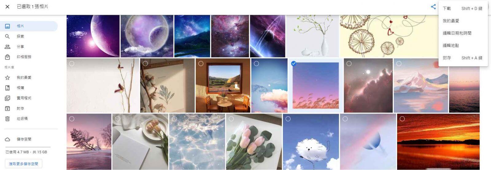 • 從 Google 相簿下載照片:開啟瀏覽器並前往 photos.google.com > 登入您的帳戶 > 選擇您需要的圖片 > 點擊右上角的按鈕 > 點擊“下載”將其儲存到電腦。