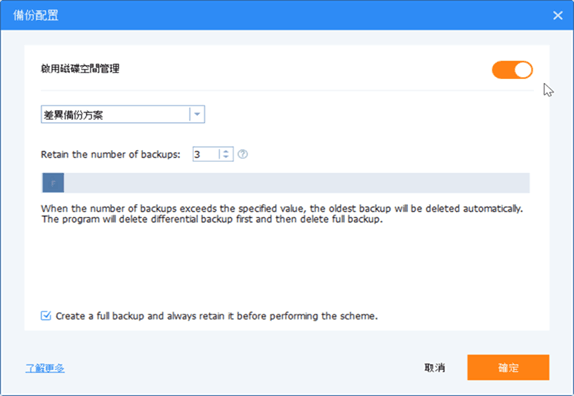 根據指定的值自動刪除舊的備份映像,以節省目標磁盤空間。