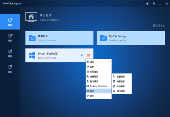 創建新的備份或管理現有的備份任務,例如還原,編輯和刪除備份,瀏覽,檢查和定位映像,甚至將映像合併為一個。
