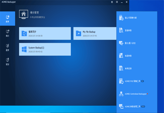 有用的實用程式,例如創建可啟動媒體、瀏覽映像、AOMEI PXE引導工具,以及更多幫助您管理數據備份和災難恢復的工具。