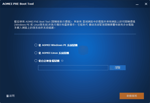 AOMEI PXE啟動工具可以從網路中的微型系統啟動許多電腦。 啟動後,您可以使用映像檔案隨附的工具備份、還原或維護系統。