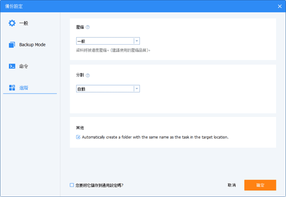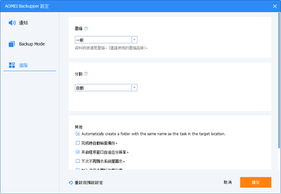 您可以啟用電子郵件或SMS通知,選擇備份模式,使用VSS或調整壓縮級別,更改語言等。