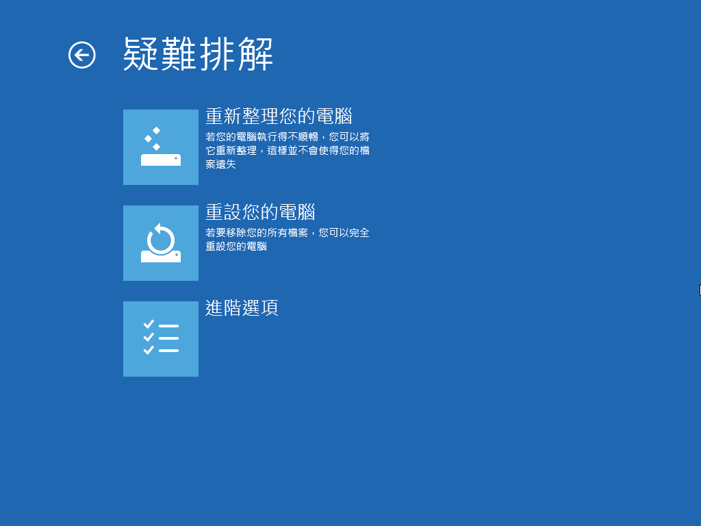 前兩個選項都是重灌 Windows,但第一個選項支援您選擇保留或刪除檔案。第三種選擇是使用恢復工具修復您的電腦,例如系統還原、系統映像恢復、啟動修復、命令提示字元等。