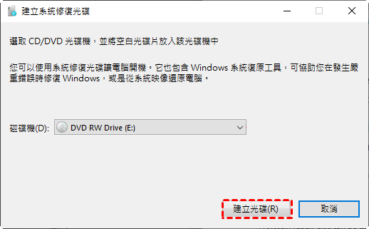 使用備份和還原在 Windows 10/11 中建立系統修復光碟 >>了解更多 它用於建立修復 CD/DVD。 |
