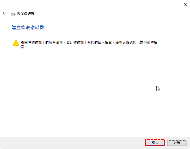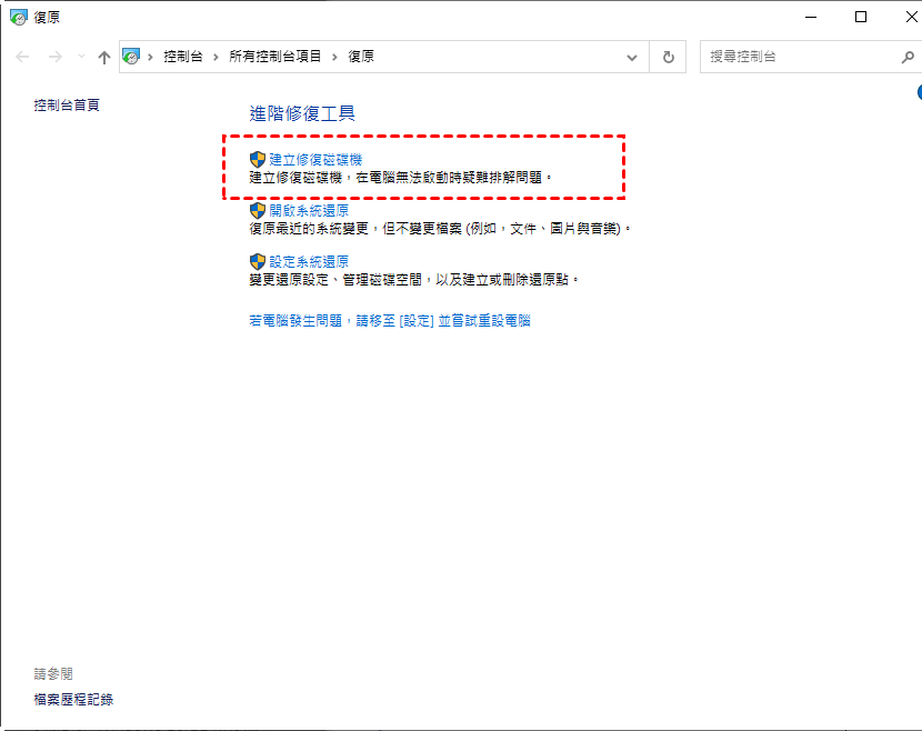 方法3. 使用備份與還原建立 Windows 10 修復碟
