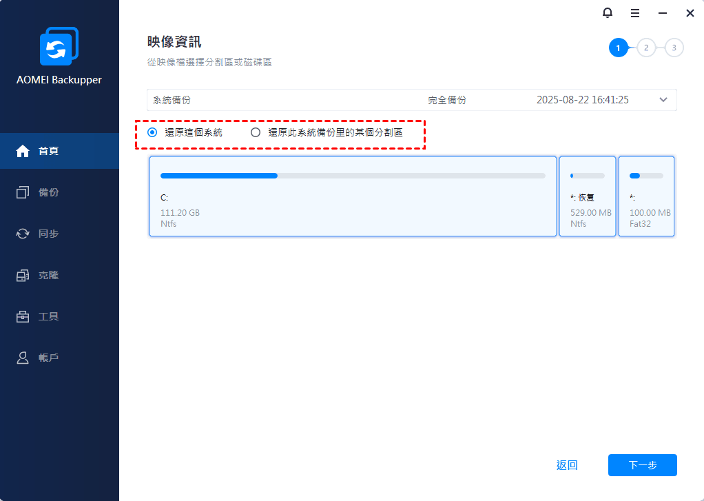 4. 請選擇“還原這個系統”或者還原某個分割區,再點選下一步。
