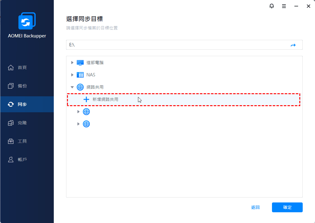 3. 點選第二個方塊來選擇目標路徑。您可以展開網路共用,點選“新增網路共用”來新增目標位置。