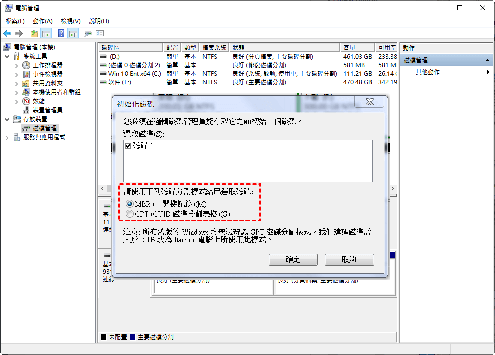 ●右鍵點選新 SSD 並選擇初始化磁碟。選擇 MBR 或 GPT 分割區樣式。