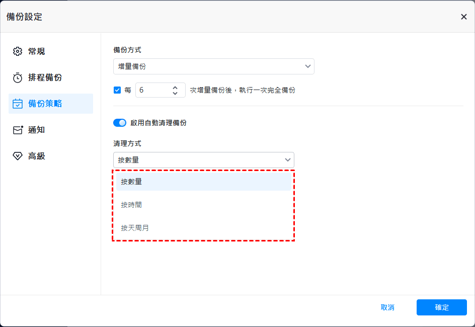 ❆策略(專業版可用):此功能用於管理備份磁碟空間並刪除特定角色的舊備份。AOMEI Backupper 根據使用者不同的需求提供5種不同的備份策略。