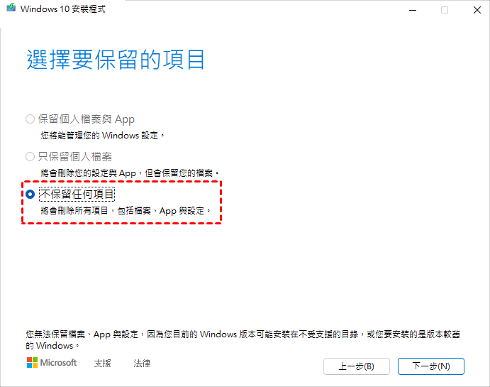 步驟6. 在“選擇要保留的項目”螢幕中,確保選擇“不保留任何項目”,然後再次選擇“下一步”。