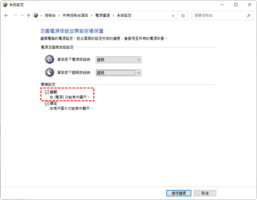 步驟5. 關機設定部分將顯示。勾選休眠選項並點選儲存更改。