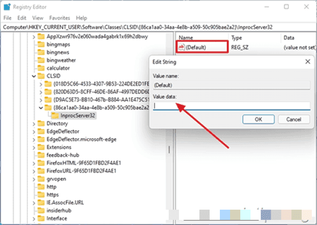 步驟 7. 輕按兩下(預設)註冊表項,然後按 Enter(不鍵入任何內容)將其值設為空白。在進行此變更之前,您將在資料列下看到它顯示(未設定值),但是一旦您按 Enter 鍵,它就不會顯示任何內容。