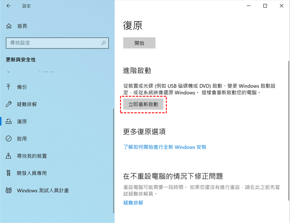 1. 在搜索框中輸入“復原”並選擇“復原選項”。然後,按“進階啟動”下的“立即重新啟動”以訪問 Windows 修復環境。