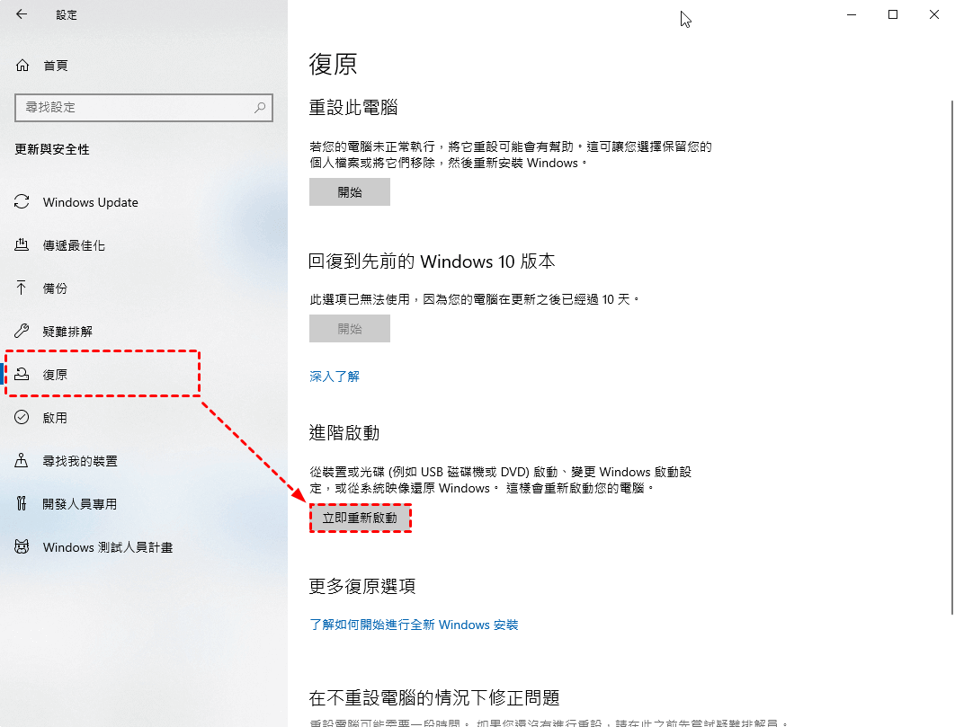 1. 導航到開始 > 設定 > 更新與安全性 > 復原。