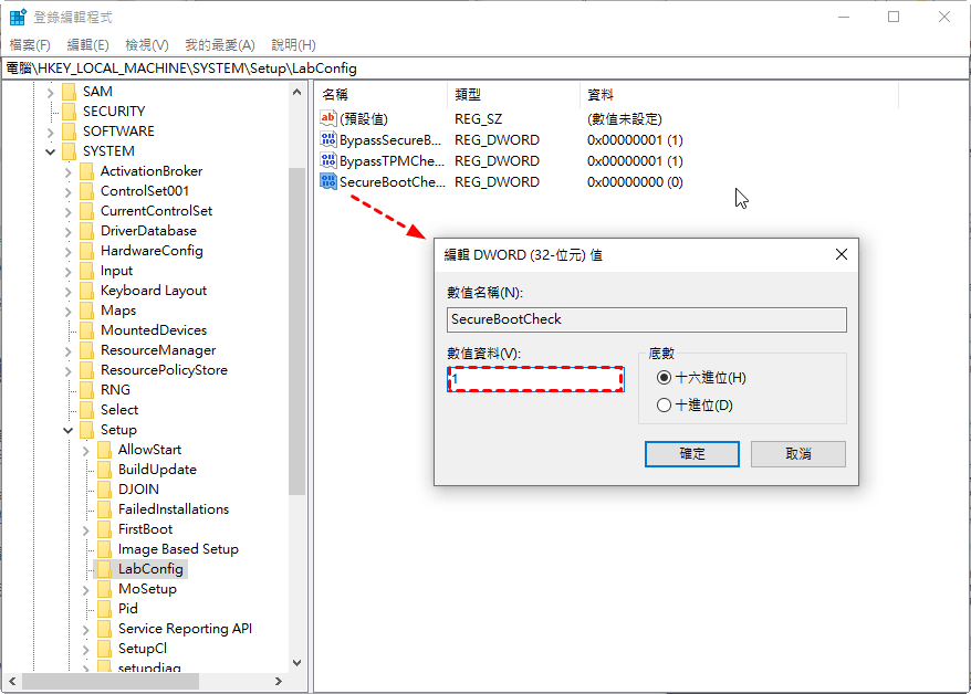 2. 在彈出的註冊表編輯器中,導航至 電腦\HKEY_LOCAL_MACHINE\SYSTEM\Setup,右鍵點選 Setup 資料夾以創建一個新註冊表項,並將其命名為“LabConfig”。