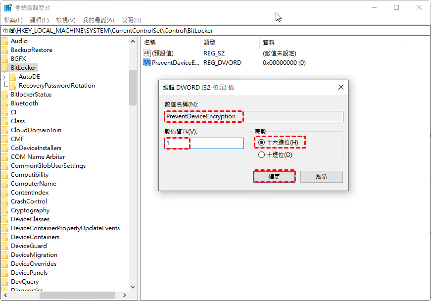 電腦\HKEY_LOCAL_MACHINE\SYSTEM\CurrentControlSet\Control\BitLocker。