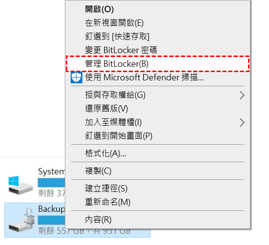 步驟2. 右鍵點選要禁用 BitLocker 的磁碟機,然後選擇“管理 BitLocker”選項。