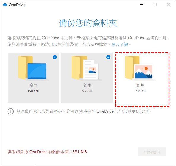 步驟3. 在這裡,您將看到所有重要的PC資料夾,取消選中“圖片”資料夾,然後點擊“開始備份”。