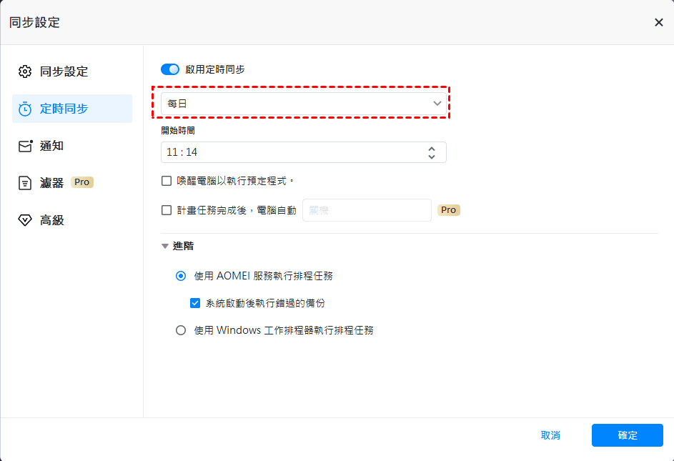 - 定時同步:在免費版本中,您可以根據每日、每週或每月的設定,自動將“圖片”資料夾從C磁碟機同步到D槽。在進階版本中,您仍然可以享受事件觸發和USB插入功能。
