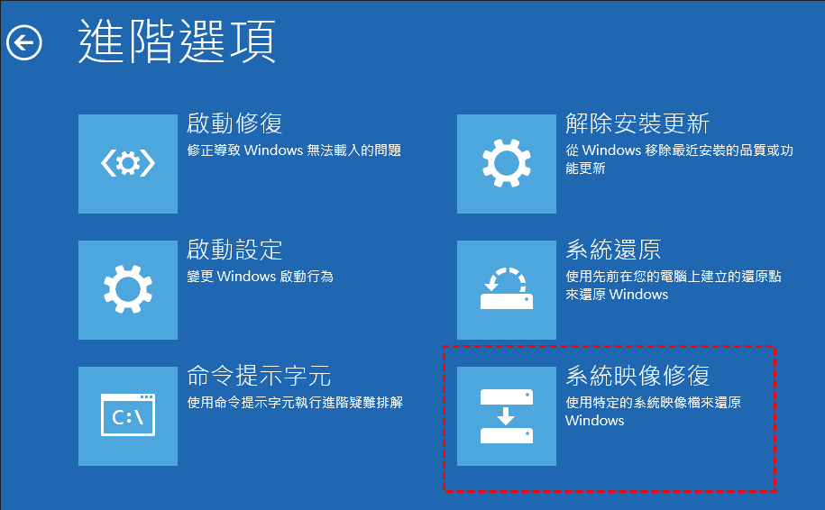 若系統無法啟動,使用Windows 安裝媒體啟動,選擇修復您的電腦 > 系統映像修復。