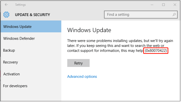‘There were some problems installing updates, but we'll try again later. If you keep seeing this and want to search the web or contact support for information, this may help: (0x80070422)’