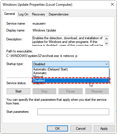 3. On the General tab, change the Startup type to Disabled and click the OK button.