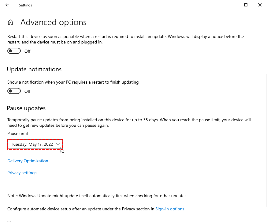 3. Find the Pause updates section, and click the option to select a date. In the expanded menu, the duration of the pause update can be up to 35 days.
