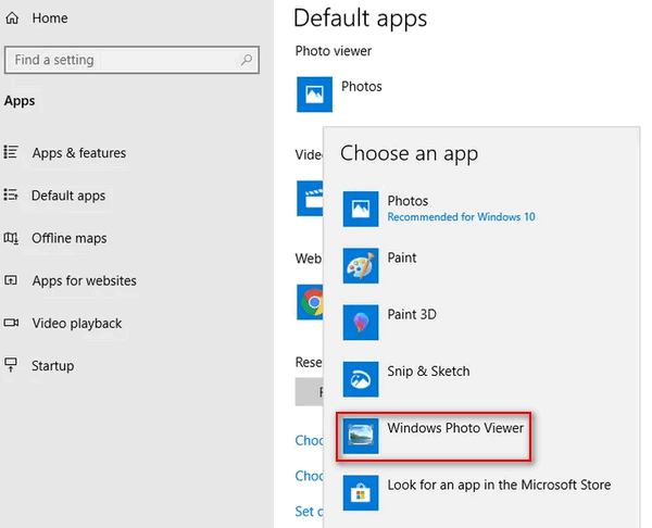One of the easiest ways to restore Windows Photo Viewer is through the Default Apps settings: