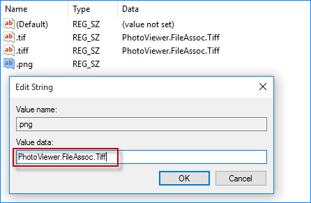 Step 4: Set the value data to PhotoViewer.FileAssoc.Tiff (replace .jpg or .png with the relevant file extension).