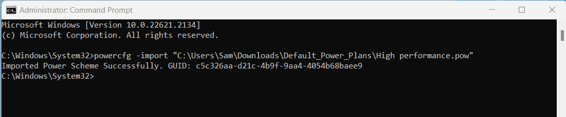 powercfg -import "C:\Users\Sam\Downloads\Default_Power_Plans\High performance.pow"