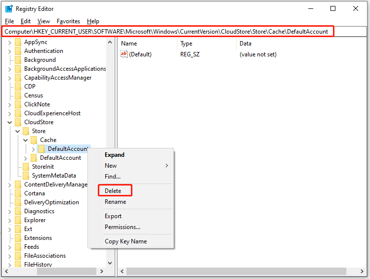 HKEY_Current_User > SOFTWARE> Microsoft > Windows > CurrentVersion > CloudStore > Store > Cache > DefaultAccount