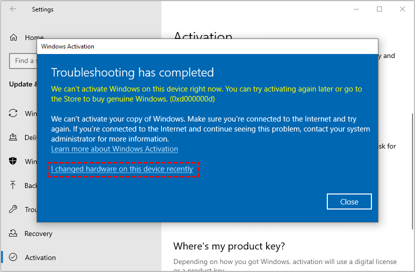 1. Go to Settings > Update & Security > Activation. Click Troubleshoot and select I changed hardware on this device recently.