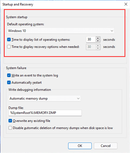 - Then, you can select the default operating system you wish to directly boot from. The choice of Time to display list of operating systems is useful so you can choose your preferred OS in that time limit. Click OK to save the changes.