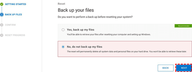 3. Next, it will recommend you backup the files before starting factory reset. You can choose the option Yes, back up my files or No, do not back up my files according to your needs.