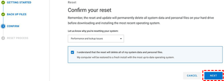 5. Next, you need to confirm your reset. As for why you need to reset your computer, select a reason from the drop-down menu. Select I understand that the reset will delete all of my system data and personal files check box, and then click NEXT.