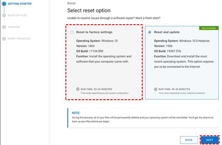 2. It will show you the System reset options. Select Reset to factory settings, and then click NEXT.