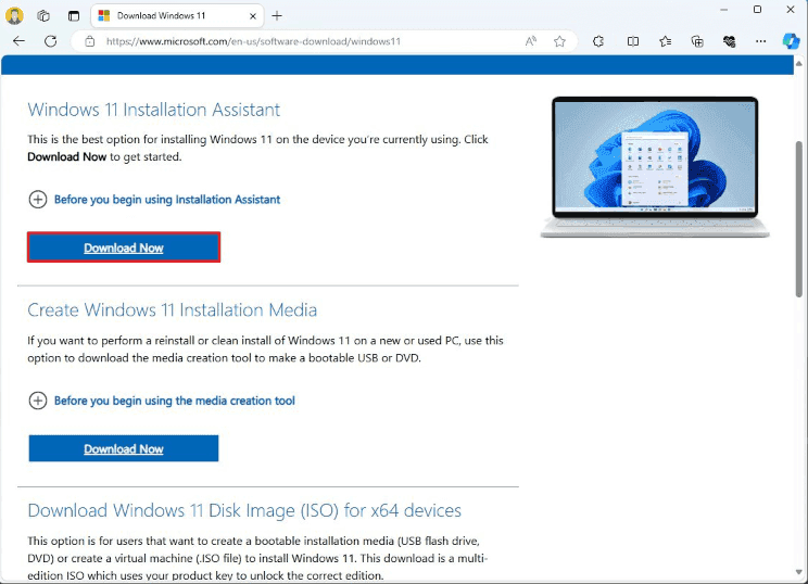 2. Click the "Download Now" button in the "Windows 11 Installation Assistant" section.