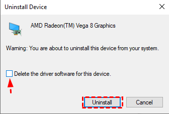 Step 4. Select the Delete the driver software for this device check box, and then select Uninstall.
