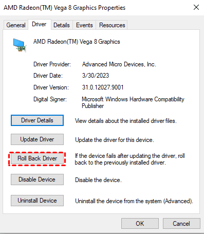 Step 4. Select the Driver tab, and then select Roll Back Driver > OK.