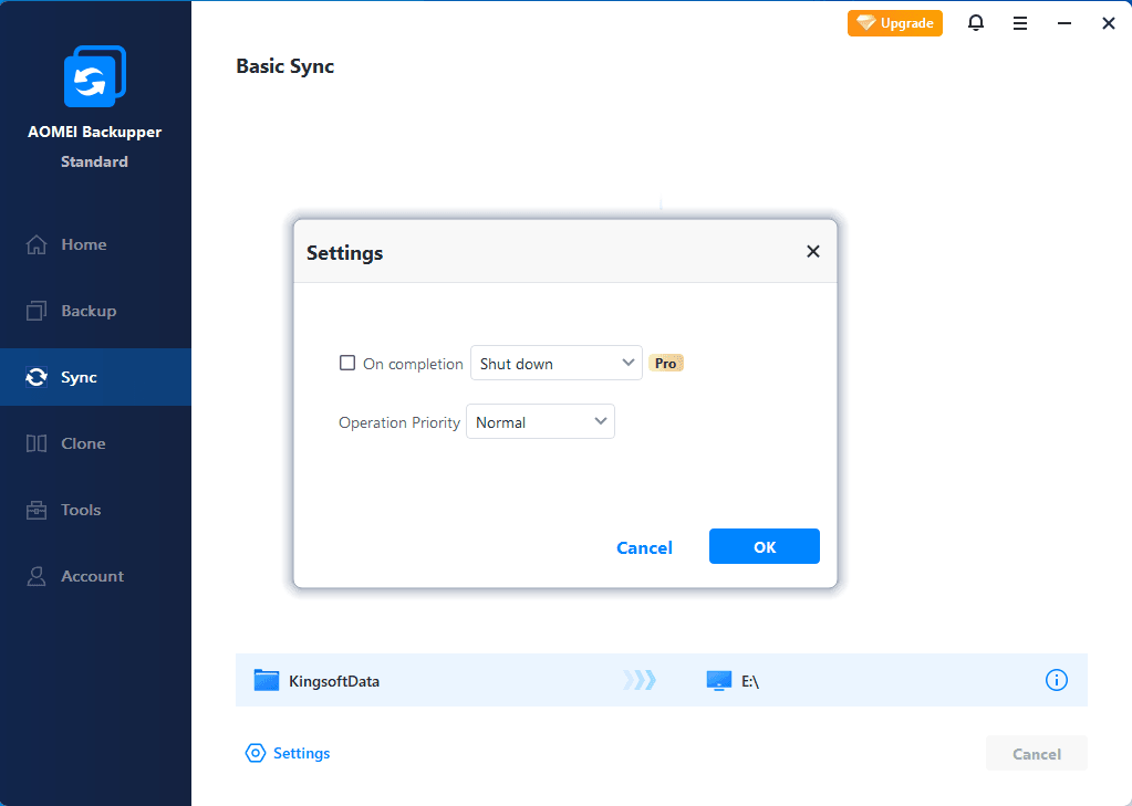 AOMEI Backupper Standard is a free software with multiple features such as restore, clone, backup, etc. It has the feature of Basic Sync that allows you to sync folders to other locations, such as external hard drives, NAS, removable USB flash drives, etc. For basic sync, it's like Window's "copy" feature, no image files are created after the sync process is completed, so you can view the content at any time.