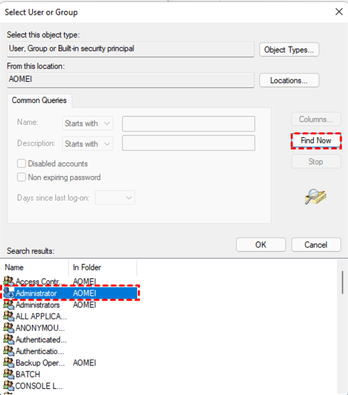 - Once another window opens, click Advanced -> Find Now. Select the Administrator account or Administrator group and click OK. Then click OK once more to confirm the changes.
