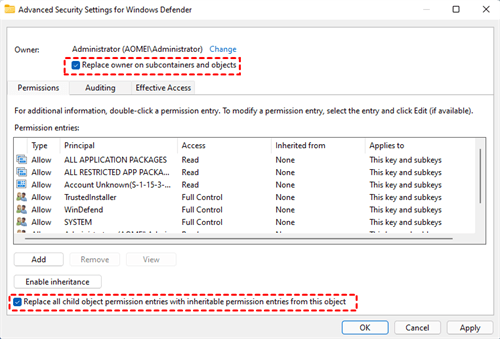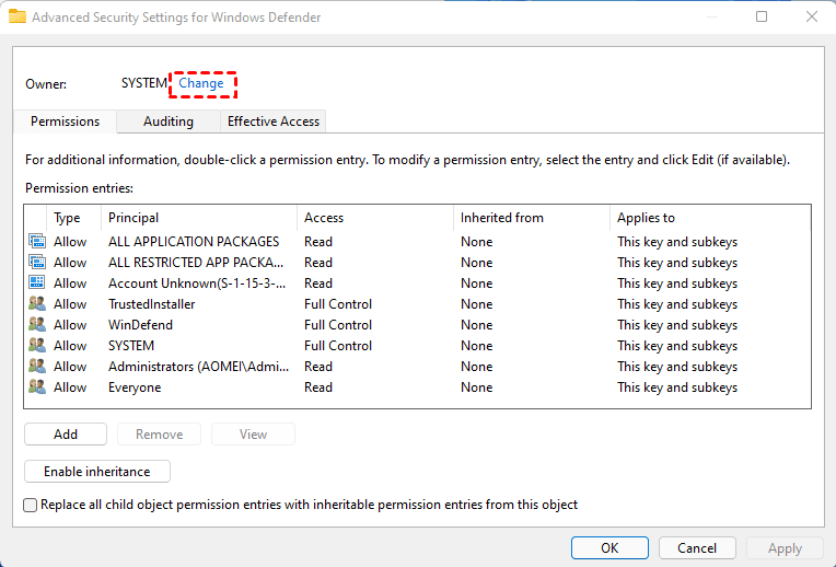 - Then click Advanced tab in the Permissions for Windows Defender window. Next, click Change to the right of the Owner field.