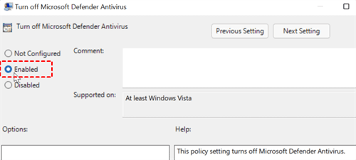 - In the pop-up window, select Enabled and click OK to apply the changes. When you are done, restart your Windows 11 computer. After the system restarts, Windows Defender antivirus is disabled on Windows 11.