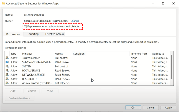 Step 3. Click Change on the Owner tab, then input the account name and click Check Names.