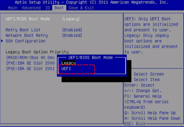 4. In the pop-up window, select the UEFI Boot Mode and then press Enter.