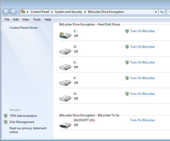 Step 1. Click the Start button on the taskbar and then go to Control Panel > System and Security > BitLocker Drive Encryption. Click on Manage BitLocker and the window will show you to turn on BitLocker to the specific drive.