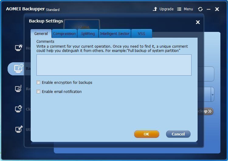 If you want to set up more for the disk backup, for example, add a comment, you can click Options, and set it under the General label.